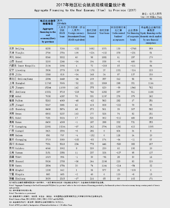 中證網(wǎng)訊 央行網(wǎng)站1月29日消息,央行今日發(fā)布2017年地區(qū)社會(huì)融資規(guī)模增量統(tǒng)計(jì)表。統(tǒng)計(jì)表顯示,2017年廣東社會(huì)融資規(guī)模增量22091億元,在各省市中排名第一位。江蘇、浙江、上海2017年社會(huì)融資規(guī)模增量超萬(wàn)億元。
