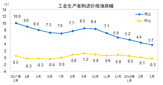 2018年3月份,全國工業(yè)生產(chǎn)者出廠價格同比上漲3.1%,環(huán)比下降0.2%。工業(yè)生產(chǎn)者購進價格同比上漲3.7%,環(huán)比下降0.3%。一季度,工業(yè)生產(chǎn)者出廠價格同比上漲3.7%,工業(yè)生產(chǎn)者購進價格同比上漲4.4%。