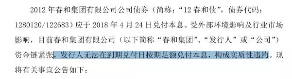 “違約老司機(jī)”春和集團(tuán)股份有限公司(簡(jiǎn)稱“春和集團(tuán)”)帶來(lái)今天第二個(gè)“雷”:其發(fā)行規(guī)模5.4億元的債券“12春和債”也構(gòu)成實(shí)質(zhì)性違約。