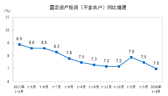 2018年1-4 月份,全國固定資產(chǎn)投資(不含農(nóng)戶)154358億元,同比增長7%,增速比1-3月份回落0.5個百分點。從環(huán)比速度看,4月份固定資產(chǎn)投資(不含農(nóng)戶)增長0.52%。其中,民間固定資產(chǎn)投資95449億元,同比增長8.4%。