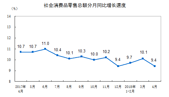 2018年4月份,社會(huì)消費(fèi)品零售總額28542億元,同比名義增長(zhǎng)9.4%(扣除價(jià)格因素實(shí)際增長(zhǎng)7.9%,以下除特殊說(shuō)明外均為名義增長(zhǎng))。其中,限額以上單位消費(fèi)品零售額11241億元,增長(zhǎng)7.8%。
