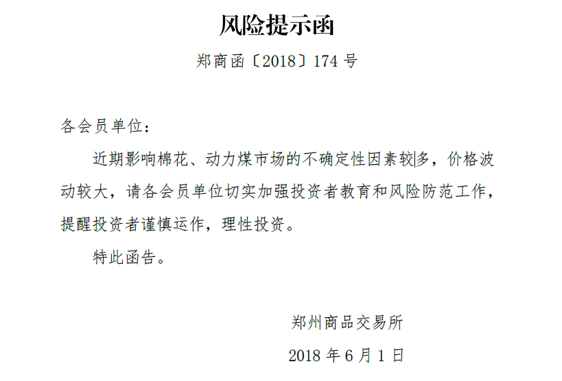 中證網(wǎng)訊 鄭商所網(wǎng)站6月1日發(fā)布風(fēng)險(xiǎn)提示稱,近期影響棉花、動(dòng)力煤市場(chǎng)的不確定性因素較多,價(jià)格波動(dòng)較大,請(qǐng)各會(huì)員單位切實(shí)加強(qiáng)投資者教育和風(fēng)險(xiǎn)防范工作,提醒投資者謹(jǐn)慎運(yùn)作,理性投資。