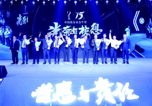 中國財富傳媒集團董事長、中國證券報有限責任公司董事長葛瑋(左一)與招商證券股份有限公司總裁王巖(右一)同十大金;鸸芾砉敬砗嫌。 本報記者 車亮 攝