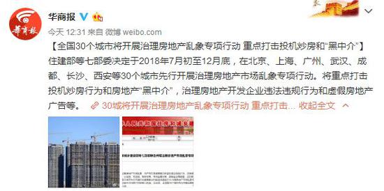 針對(duì)近期房地產(chǎn)市場(chǎng)亂象,為嚴(yán)厲打擊侵害群眾利益的違法違規(guī)行為,住房城鄉(xiāng)建設(shè)部會(huì)同中宣部、公安部、司法部、稅務(wù)總局、市場(chǎng)監(jiān)管總局、銀保監(jiān)會(huì)等部委,近日聯(lián)合印發(fā)了《關(guān)于在部分城市先行開(kāi)展打擊侵害群眾利益違法違規(guī)行為 治理房地產(chǎn)市場(chǎng)亂象專項(xiàng)行動(dòng)的通知》,決定于2018年7月初至12月底,在北京、上海等30個(gè)城市先行開(kāi)展治理房地產(chǎn)市場(chǎng)亂象專項(xiàng)行動(dòng)。