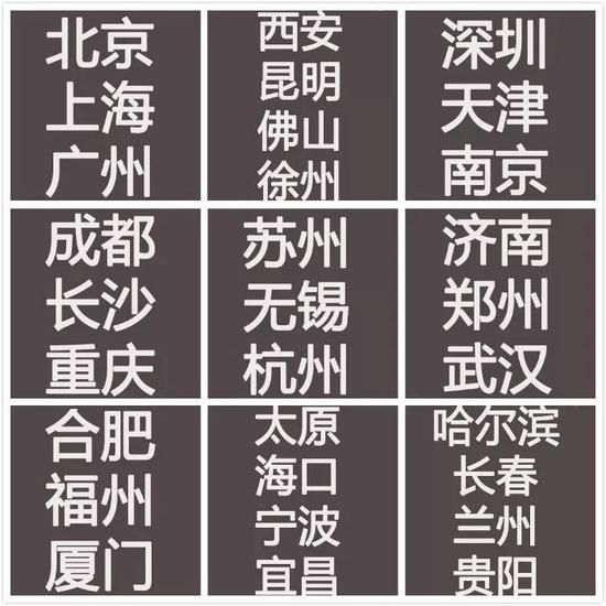 北京、上海、廣州、深圳、天津、南京、蘇州、無(wú)錫、杭州、合肥、福州、廈門、濟(jì)南、鄭州、武漢、成都、長(zhǎng)沙、重慶、西安、昆明、佛山、徐州、太原、?、寧波、宜昌、哈爾濱、長(zhǎng)春、蘭州、貴陽(yáng)。