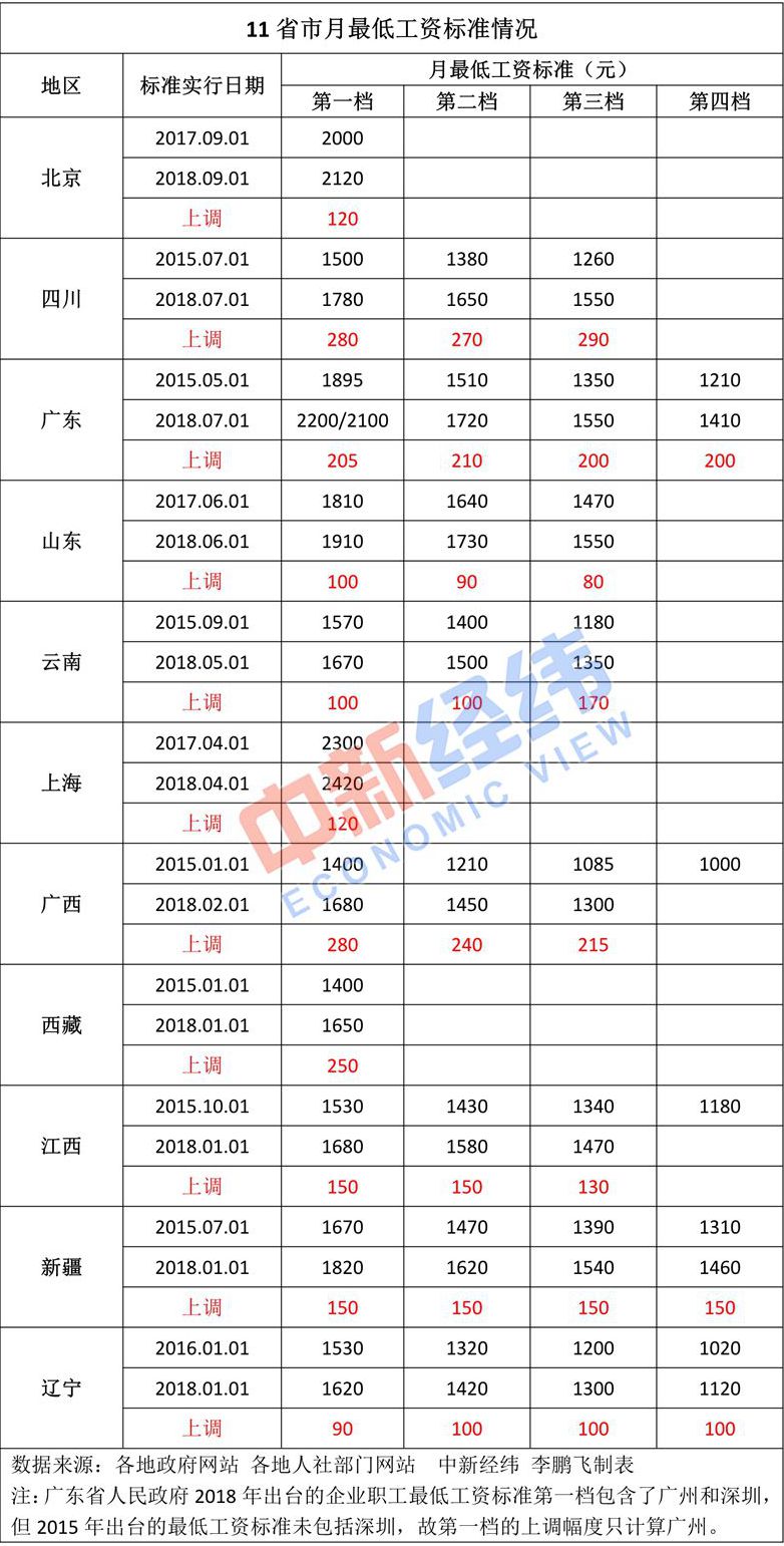 公開資料顯示,除上述11省市外,安徽、重慶的最低工資標準也很有可能在2018年上調(diào)。