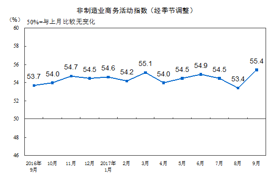 2017年9月份,中國非制造業(yè)商務(wù)活動(dòng)指數(shù)為55....">