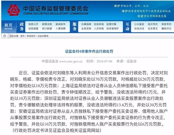 證監(jiān)會決定對劉曉東、楊威、李儒柏責(zé)令改正,對劉曉東處以70萬元罰款,對楊威處以20萬元罰款,對李儒柏處以10萬元罰款,三人總計被罰100萬元。