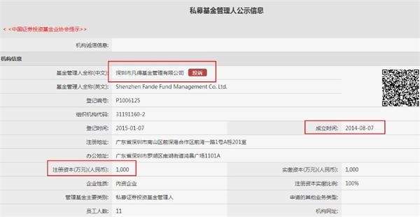 據(jù)基金業(yè)協(xié)會備案信息顯示,凡得基金于2015年1月7日登記,注冊資本1000萬元,員工人數(shù)11人,辦公地點位于深圳。
