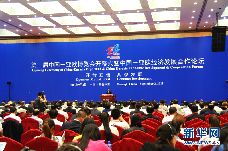 第三屆中國-亞歐博覽會于9月2日下午3點(diǎn)在新疆國際會展中心開幕 這是中國—亞歐經(jīng)濟(jì)發(fā)展合作論壇上與會嘉賓在演講。 新華網(wǎng) 張朝華 攝