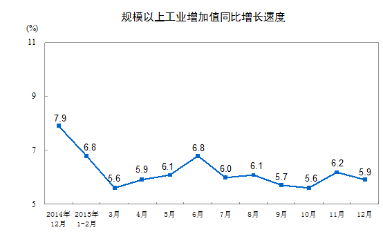 國(guó)家統(tǒng)計(jì)局1月19日公布,2015年12月份,規(guī)模以上工業(yè)增加值同比實(shí)際增長(zhǎng)5.9%(以下增加值增速均為扣除價(jià)格因素的實(shí)際增長(zhǎng)率),比11月份回落0.3個(gè)百分點(diǎn)。從環(huán)比看,12月份,規(guī)模以上工業(yè)增加值比上月增長(zhǎng)0.41%。2015年全年,規(guī)模以上工業(yè)增加值比上年增長(zhǎng)6.1%。