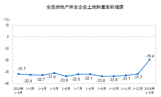 1-2月份,房地產(chǎn)開發(fā)企業(yè)土地購置面積2236萬平方米,同比下降19.4%,降幅比去年全年收窄12.3個百分點;土地成交價款705億元,增長0.9%,去年全年為下降23.9%。