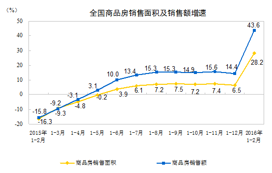 2016年1-2月份,全國房地產(chǎn)開發(fā)投資9052億元,同比名義增長3.0%,增速比去年全年提高2個百分點。其中,住宅投資6028億元,增長1.8%,提高1.4個百分點。住宅投資占房地產(chǎn)開發(fā)投資的比重為66.6%。