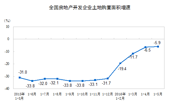 1-5月份,房地產(chǎn)開發(fā)企業(yè)土地購置面積7196萬平方米,同比下降5.9%,降幅比1-4月份收窄0.6個百分點;土地成交價款2295億元,增長4.7%,1-4月份為下降0.2%。