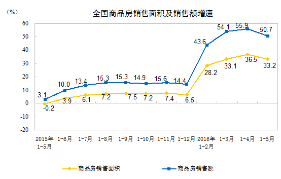 1-5月份,商品房銷售面積47954萬平方米,同比增長33.2%,增速比1-4月份回落3.3個百分點。其中,住宅銷售面積增長34.2%,辦公樓銷售面積增長44.0%,商業(yè)營業(yè)用房銷售面積增長18.1%。商品房銷售額36775億元,增長50.7%,增速回落5.2個百分點。其中,住宅銷售額增長53.4%,辦公樓銷售額增長72.8%,商業(yè)營業(yè)用房銷售額增長21.2%。