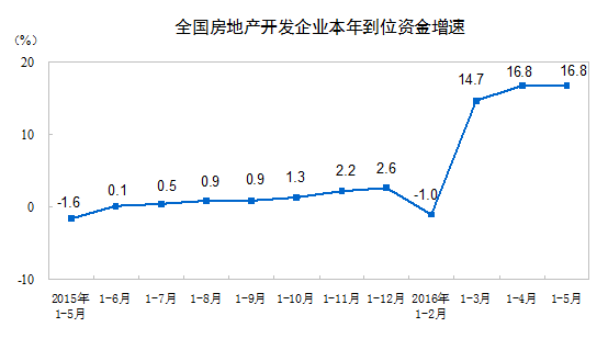 1-5月份,房地產(chǎn)開發(fā)企業(yè)到位資金53681億元,同比增長16.8%,增速與1-4月份持平。其中,國內(nèi)貸款8945億元,增長2.3%;利用外資42億元,下降72.1%;自籌資金18643億元,增長1.4%;其他資金26051億元,增長39.4%。在其他資金中,定金及預(yù)收款14840億元,增長35.2%;個人按揭貸款8838億元,增長58.5%。