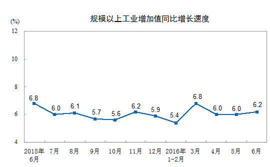2016年6月份,規(guī)模以上工業(yè)增加值同比實際增長6.2%(以下增加值增速均為扣除價格因素的實際增長率),比5月份加快0.2個百分點。從環(huán)比看,6月份,規(guī)模以上工業(yè)增加值比上月增長0.47%。1-6月份,規(guī)模以上工業(yè)增加值同比增長6.0%。