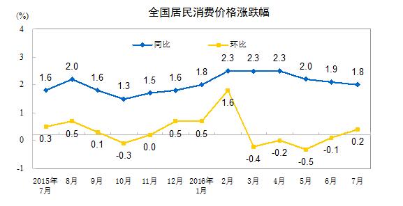 2016年7月份,全國(guó)居民消費(fèi)價(jià)格總水平同比上漲1.8%。其中,城市上漲1.8%,農(nóng)村上漲1.5%;食品價(jià)格上漲3.3%,非食品價(jià)格上漲1.4%;消費(fèi)品價(jià)格上漲1.4%,服務(wù)價(jià)格上漲2.3%。