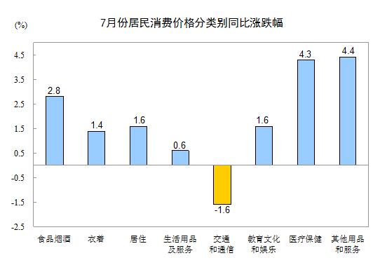 7月份,其他七大類價(jià)格同比六漲一降。其中,其他用品和服務(wù)、醫(yī)療保健、居住、教育文化和娛樂(lè)、衣著、生活用品及服務(wù)價(jià)格分別上漲4.4%、4.3%、1.6%、1.6%、1.4%、0.6%;交通和通信價(jià)格下降1.6%。