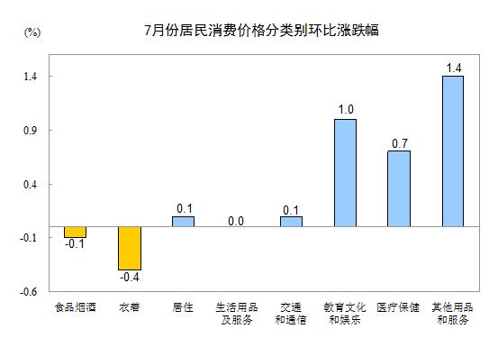 7月份,其他七大類價(jià)格環(huán)比五漲一降一平。其中,其他用品和服務(wù)、教育文化和娛樂(lè)、醫(yī)療保健、居住、交通和通信價(jià)格分別上漲1.4%、1.0%、0.7%、0.1%、0.1%;衣著價(jià)格下降0.4%;生活用品及服務(wù)價(jià)格持平。