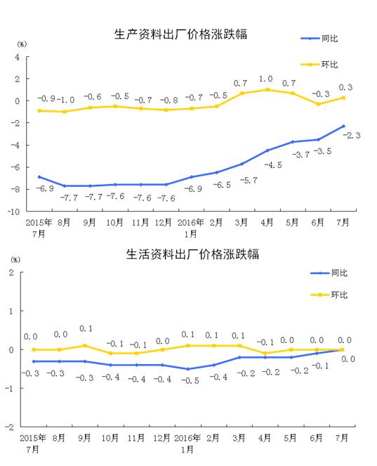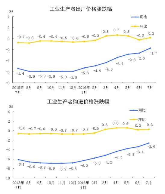 2016年7月份,全國工業(yè)生產者出廠價格環(huán)比上漲0.2%,同比下降1.7%。工業(yè)生產者購進價格環(huán)比上漲0.3%,同比下降2.6%。1-7月平均,工業(yè)生產者出廠價格同比下降3.6%,工業(yè)生產者購進價格同比下降4.5%。