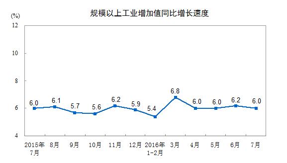 2016年7月份,規(guī)模以上工業(yè)增加值同比實(shí)際增長(zhǎng)6.0%(以下增加值增速均為扣除價(jià)格因素的實(shí)際增長(zhǎng)率),較6月份回落0.2個(gè)百分點(diǎn)。從環(huán)比看,7月份,規(guī)模以上工業(yè)增加值增長(zhǎng)0.52%,比上月加快0.02個(gè)百分點(diǎn)。1-7月份,規(guī)模以上工業(yè)增加值同比增長(zhǎng)6.0%。