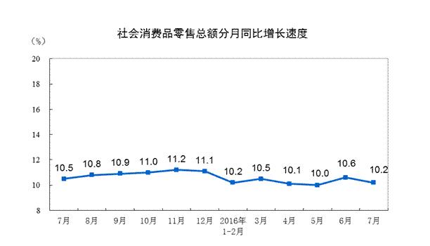 2016年7月份,社會(huì)消費(fèi)品零售總額26827億元,同比名義增長10.2%(扣除價(jià)格因素實(shí)際增長9.8%,以下除特殊說明外均為名義增長)。其中,限額以上單位消費(fèi)品零售額11806億元,增長7.3%。