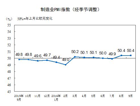 2016年9月份,中國(guó)制造業(yè)采購(gòu)經(jīng)理指數(shù)(PMI)為50.4%,與上月持平,繼續(xù)高于臨界點(diǎn)。
