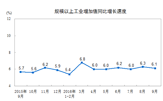 2016年9月份,規(guī)模以上工業(yè)增加值同比實(shí)際增長(zhǎng)6.1%(下同,增加值增速均為扣除價(jià)格因素的實(shí)際增長(zhǎng)率),較8月份回落0.2個(gè)百分點(diǎn)。從環(huán)比看,9月份,規(guī)模以上工業(yè)增加值比上月增長(zhǎng)0.47%。1-9月份,規(guī)模以上工業(yè)增加值同比增長(zhǎng)6.0%。