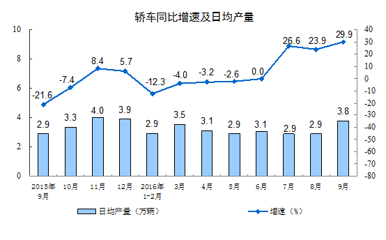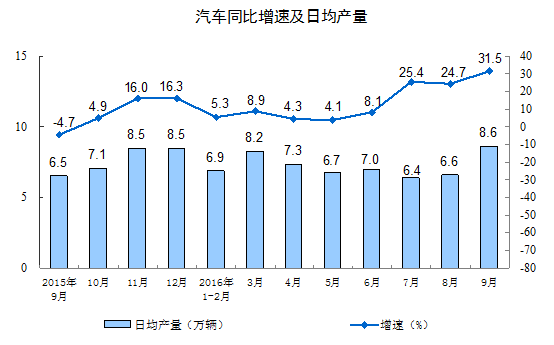 分產(chǎn)品看,9月份,統(tǒng)計(jì)的589種主要產(chǎn)品中有341種產(chǎn)品同比增長(zhǎng)。其中,鋼材9809萬(wàn)噸,同比增長(zhǎng)4.3%;水泥22393萬(wàn)噸,增長(zhǎng)2.9%;十種有色金屬452萬(wàn)噸,增長(zhǎng)2.7%;乙烯132萬(wàn)噸,下降14.4%;汽車(chē)257.6萬(wàn)輛,增長(zhǎng)31.5%;轎車(chē)113.0萬(wàn)輛,增長(zhǎng)29.9%;發(fā)電量4913億千瓦時(shí),增長(zhǎng)6.8%;原油加工量4380萬(wàn)噸,增長(zhǎng)2.4%。