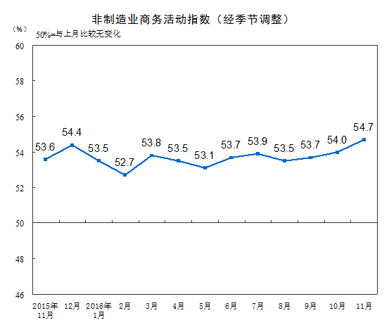 2016年11月份,中國(guó)非制造業(yè)商務(wù)活動(dòng)指數(shù)為54.7%,比上月上升0.7個(gè)百分點(diǎn),連續(xù)三個(gè)月上升,為2014年7月以來(lái)的高點(diǎn),非制造業(yè)延續(xù)了平穩(wěn)較快的增長(zhǎng)勢(shì)頭,增速進(jìn)一步加快。