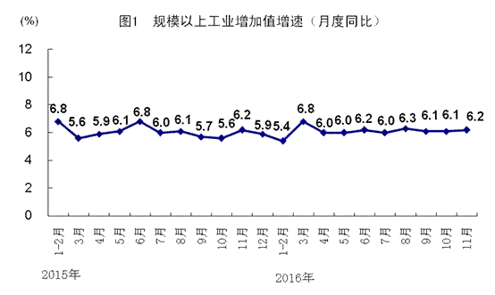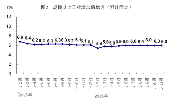 11月份,全國(guó)規(guī)模以上工業(yè)增加值按可比價(jià)格計(jì)算同比增長(zhǎng)6.2%,增速比上月加快0.1個(gè)百分點(diǎn),與上年同期持平。分經(jīng)濟(jì)類型看,國(guó)有控股企業(yè)增加值同比增長(zhǎng)4.2%,集體企業(yè)下降4.4%,股份制企業(yè)增長(zhǎng)6.6%,外商及港澳臺(tái)商投資企業(yè)增長(zhǎng)5.6%。分三大門類看,采礦業(yè)增加值同比下降2.9%,制造業(yè)增長(zhǎng)6.7%,電力、熱力、燃?xì)饧八a(chǎn)和供應(yīng)業(yè)增長(zhǎng)9.9%。工業(yè)結(jié)構(gòu)繼續(xù)優(yōu)化,高技術(shù)產(chǎn)業(yè)和裝備制造業(yè)增加值同比分別增長(zhǎng)10.6%和10.5%,增速分別比規(guī)模以上工業(yè)快4.4和4.3個(gè)百分點(diǎn)。規(guī)模以上工業(yè)企業(yè)產(chǎn)銷率達(dá)到97.8%。從環(huán)比看,11月份全國(guó)規(guī)模以上工業(yè)增加值比上月增長(zhǎng)0.51%。1-11月份,規(guī)模以上工業(yè)增加值同比增長(zhǎng)6.0%。