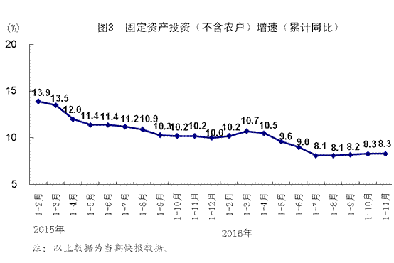 1-11月份,全國(guó)固定資產(chǎn)投資(不含農(nóng)戶)538548億元,同比增長(zhǎng)8.3%,增速與1-10月份持平。其中,國(guó)有控股投資191080億元,增長(zhǎng)20.2%;民間投資331067億元,增長(zhǎng)3.1%,比1-10月份加快0.2個(gè)百分點(diǎn),占全部投資的比重為61.5%。分產(chǎn)業(yè)看,第一產(chǎn)業(yè)投資17099億元,同比增長(zhǎng)21.9%;第二產(chǎn)業(yè)投資210062億元,增長(zhǎng)3.3%,其中制造業(yè)投資170152億元,增長(zhǎng)3.6%,比1-10月份加快0.5個(gè)百分點(diǎn);第三產(chǎn)業(yè)投資311387億元,增長(zhǎng)11.3%,其中基礎(chǔ)設(shè)施投資105938億元,增長(zhǎng)18.9%。高技術(shù)產(chǎn)業(yè)投資同比增長(zhǎng)15.9%,增速快于全部投資7.6個(gè)百分點(diǎn)。固定資產(chǎn)投資到位資金548462億元,同比增長(zhǎng)5.4%。其中,國(guó)家預(yù)算資金增長(zhǎng)16.5%,國(guó)內(nèi)貸款增長(zhǎng)8.9%,自籌資金下降0.4%,利用外資下降20.4%。新開工項(xiàng)目計(jì)劃總投資452548億元,同比增長(zhǎng)21.0%。從環(huán)比看,11月份固定資產(chǎn)投資(不含農(nóng)戶)比上月增長(zhǎng)0.54%。