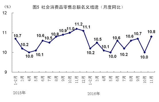 11月份,社會(huì)消費(fèi)品零售總額30959億元,同比名義增長(zhǎng)10.8%(扣除價(jià)格因素實(shí)際增長(zhǎng)9.2%),增速比上月加快0.8個(gè)百分點(diǎn)。按經(jīng)營(yíng)單位所在地分,城鎮(zhèn)消費(fèi)品零售額26748億元,同比增長(zhǎng)10.8%;鄉(xiāng)村消費(fèi)品零售額4210億元,增長(zhǎng)11.0%。按消費(fèi)類型分,餐飲收入3342億元,同比增長(zhǎng)10.1%;商品零售27617億元,增長(zhǎng)10.9%,其中限額以上單位商品零售13940億元,增長(zhǎng)9.8%。消費(fèi)升級(jí)類相關(guān)商品增勢(shì)較好,通訊器材增長(zhǎng)17.8%,文化辦公用品增長(zhǎng)15.4%,家用電器和音像器材增長(zhǎng)14.7%,汽車增長(zhǎng)13.1%。從環(huán)比看,11月份社會(huì)消費(fèi)品零售總額比上月增長(zhǎng)0.97%。1-11月份,社會(huì)消費(fèi)品零售總額同比增長(zhǎng)10.4%。