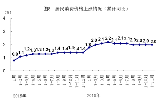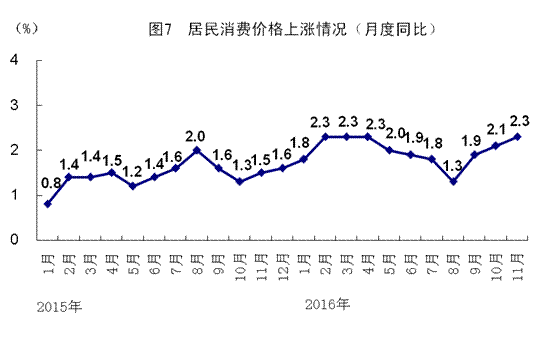 11月份,居民消費(fèi)價(jià)格同比上漲2.3%,漲幅比上月上升0.2個(gè)百分點(diǎn)。1-11月份,居民消費(fèi)價(jià)格同比上漲2.0%。分類別看,11月份,食品煙酒價(jià)格同比上漲3.2%,衣著上漲1.4%,居住上漲2.0%,生活用品及服務(wù)上漲0.3%,交通和通信價(jià)格持平,教育文化和娛樂上漲2.2%,醫(yī)療保健上漲4.4%,其他用品和服務(wù)上漲4.2%。在食品煙酒價(jià)格中,糧食價(jià)格上漲0.7%,豬肉價(jià)格上漲5.6%,鮮菜價(jià)格上漲15.8%。從環(huán)比看,11月份居民消費(fèi)價(jià)格比上月上漲0.1%。