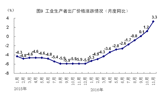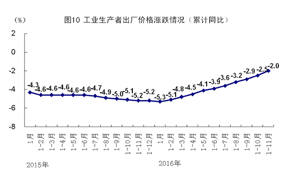 11月份,工業(yè)生產(chǎn)者出廠價(jià)格同比上漲3.3%,漲幅比上月擴(kuò)大2.1個(gè)百分點(diǎn);環(huán)比上漲1.5%。1-11月份,工業(yè)生產(chǎn)者出廠價(jià)格同比下降2.0%。11月份,工業(yè)生產(chǎn)者購(gòu)進(jìn)價(jià)格同比上漲3.5%,環(huán)比上漲1.8%。1-11月份,工業(yè)生產(chǎn)者購(gòu)進(jìn)價(jià)格同比下降2.7%。