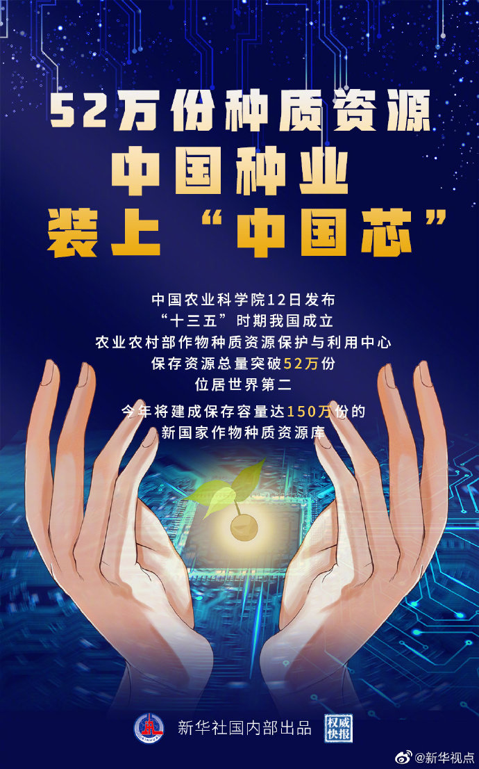 優(yōu)異資源是種業(yè)的“芯片”。據(jù)中國農(nóng)科院12日消息,“十三五”時期我國加快種質(zhì)資源保護(hù)與利用體系建設(shè),建成完善了由1座長期庫、1座復(fù)份庫、10座中期庫、43個種質(zhì)圃、205個原生境保護(hù)點以及種質(zhì)資源信息中心組成的國家作物種質(zhì)資源保護(hù)體系;成立了農(nóng)業(yè)農(nóng)村部作物種質(zhì)資源保護(hù)與利用中心,保存資源總量突破52萬份,位居世界第二。新國家作物種質(zhì)資源庫將于今年建成使用,可保存150萬份種質(zhì)資源,極大提升我國種質(zhì)資源保護(hù)能力。(記者:于文靜 海報設(shè)計:賈伊寧)