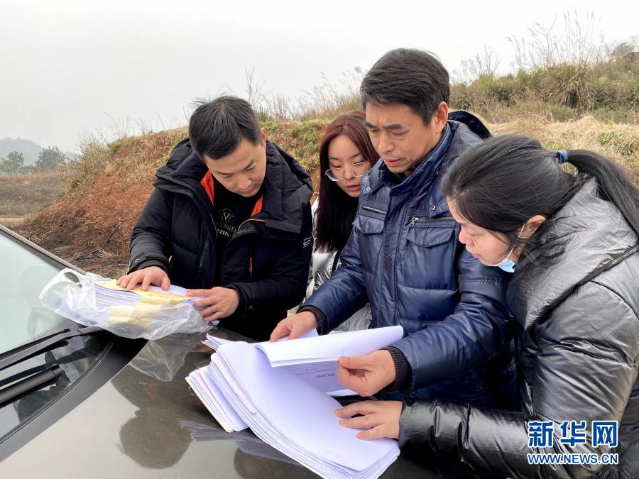 1月27日,駐麻溪口村幫扶工作隊隊長段吉廣(右二)在村內和同事們一起核查工程項目賬目資料。新華社記者 柳王敏 攝