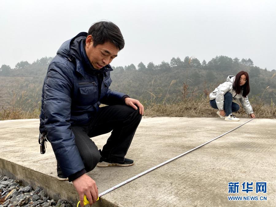 1月27日,駐麻溪口村幫扶工作隊隊長段吉廣(左)在村內進行新建道路的測量。新華社記者 柳王敏 攝