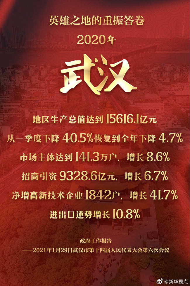 1月29日,在武漢市第十四屆人民代表大會(huì)第六次會(huì)議上,武漢市代市長(zhǎng)程用文作政府工作報(bào)告。報(bào)告指出,作為封控時(shí)間最長(zhǎng)、重啟時(shí)間最晚、疫情影響最大的城市,在一季度地區(qū)生產(chǎn)總值斷崖式下跌的情況下,搏殺二季度,沖刺三季度,決戰(zhàn)四季度,全年好于預(yù)期,經(jīng)濟(jì)總量位居全國(guó)城市前十,達(dá)到15616.1億元,同比下降4.7%,穩(wěn)住了經(jīng)濟(jì)基本盤(pán)。