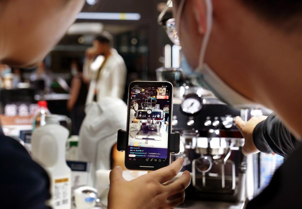 11月9日,在進(jìn)博會(huì)消費(fèi)品展區(qū),展臺(tái)的工作人員在電商平臺(tái)進(jìn)行咖啡機(jī)專場(chǎng)直播。
