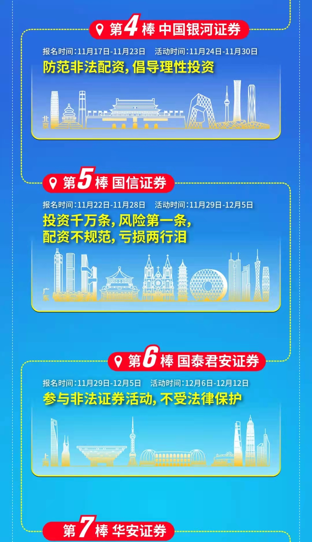 據(jù)協(xié)會(huì)披露,本次活動(dòng)將有8家券商接棒參與,分別是恒泰證券、國(guó)開證券、興業(yè)證券、中國(guó)銀河證券、國(guó)信證券、國(guó)泰君安證券、華安證券和開源證券,活動(dòng)時(shí)間為11月15日至12月19日。