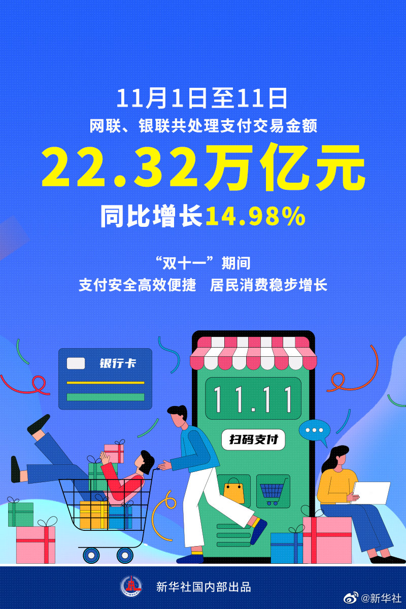 中國人民銀行12日發(fā)布數(shù)據(jù)顯示,“雙十一”期間(11月1日至11月11日)網(wǎng)聯(lián)、銀聯(lián)共處理支付交易270.48億筆,金額22.32萬億元,分別同比增長17.96%和14.98%。11日網(wǎng)聯(lián)、銀聯(lián)合計最高業(yè)務峰值9.65萬筆/秒。“雙十一”期間,支付服務安全、高效、便捷,支付業(yè)務規(guī)模和居民消費穩(wěn)步增長。(記者吳雨,海報設計楊軼群)
