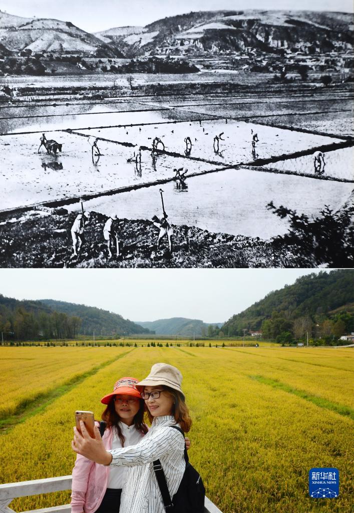 這是一張拼版照片,上圖為抗戰(zhàn)時期延安南泥灣的生產(chǎn)場景(資料圖片);下圖為2018年9月12日,游客在延安南泥灣稻田旁留影(新華社記者劉瀟攝 )。新華社發(fā)