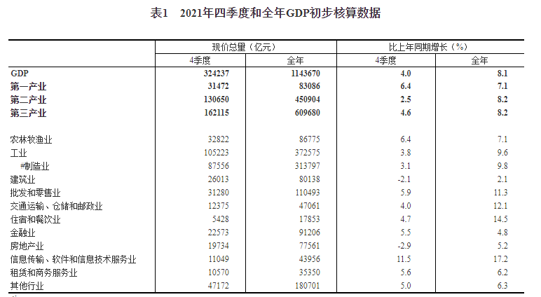 國家統(tǒng)計局1月18日消息,根據(jù)有關(guān)基礎(chǔ)資料和國民經(jīng)濟(jì)核算方法,我國2021年四季度和全年國內(nèi)生產(chǎn)總值(以下簡稱GDP)初步核算結(jié)果公布,去年四季度信息傳輸、軟件和信息技術(shù)服務(wù)業(yè)GDP同比增長11.5%,全年增長17.2%。