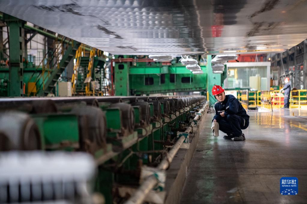 1月31日,在西南鋁業(yè)(集團)有限責(zé)任公司生產(chǎn)車間,工人觀察鋁材吊運情況。新華社記者 唐奕 攝