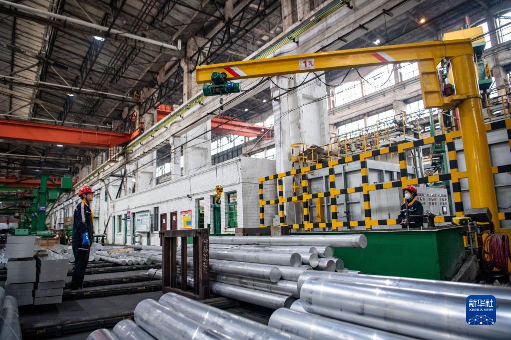 1月31日,在西南鋁業(yè)(集團)有限責(zé)任公司生產(chǎn)車間,工人在使用機械設(shè)備吊運鋁材。新華社記者 唐奕 攝