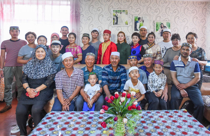 這是家住內(nèi)蒙古呼倫貝爾的夏民山(前排右三)家的家庭合影。他家由回族、漢族、蒙古族、達斡爾族、鄂溫克族、滿族共6個民族組成,45口人,三代同堂(2017年7月16日攝)。新華社記者 連振 攝