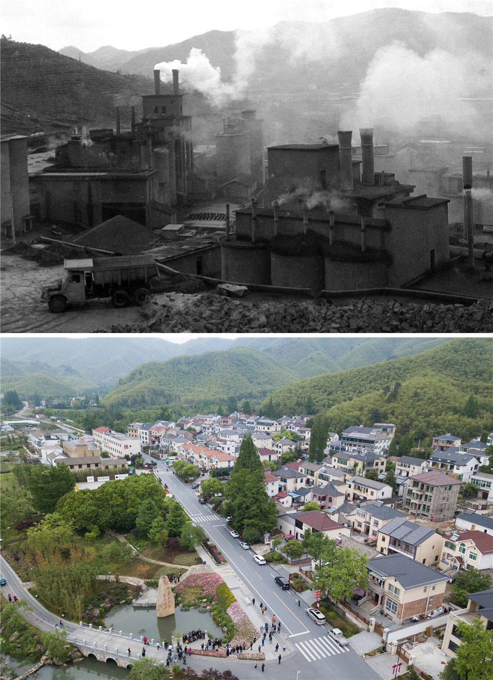 30多年前,依靠優(yōu)質(zhì)的石灰?guī)r資源,“采石經(jīng)濟(jì)”紅紅火火,可環(huán)境卻遭了殃,植被破壞、灰塵漫天、溪水渾濁。痛定思痛,余村人決定關(guān)停水泥廠和石灰礦,求還綠水青山。