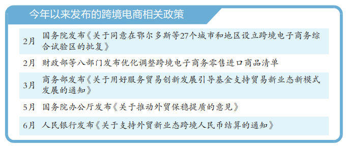 2021年7月,國務(wù)院辦公廳發(fā)布《關(guān)于加快發(fā)展外貿(mào)新業(yè)態(tài)新模式的意見》,明確提出扎實推進(jìn)跨境電商綜試區(qū)建設(shè)。2022年2月,國務(wù)院發(fā)布《關(guān)于同意在鄂爾多斯等27個城市和地區(qū)設(shè)立跨境電子商務(wù)綜合試驗區(qū)的批復(fù)》,標(biāo)志著跨境電商先行先試的試驗田規(guī)模不斷擴(kuò)大。5月,國務(wù)院辦公廳發(fā)布《關(guān)于推動外貿(mào)保穩(wěn)提質(zhì)的意見》,進(jìn)一步提出推動跨境電商加快發(fā)展提質(zhì)增效。